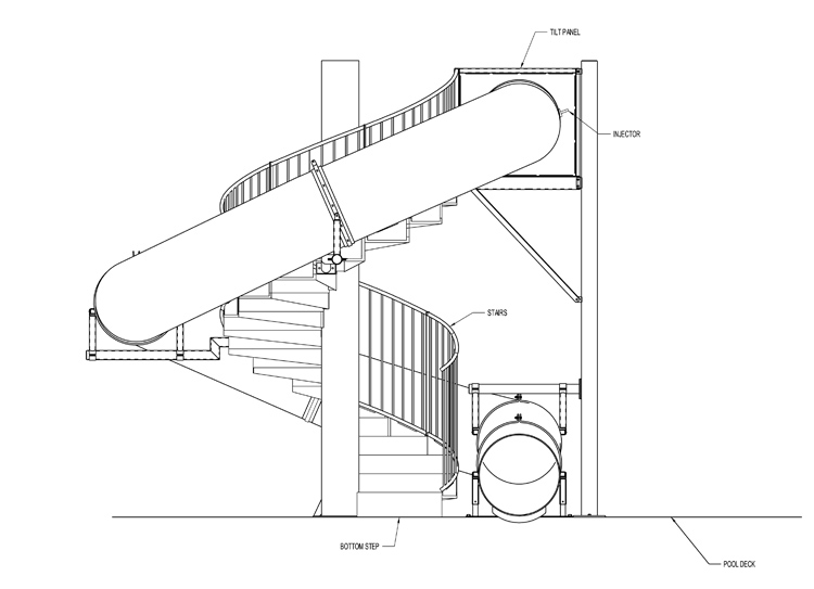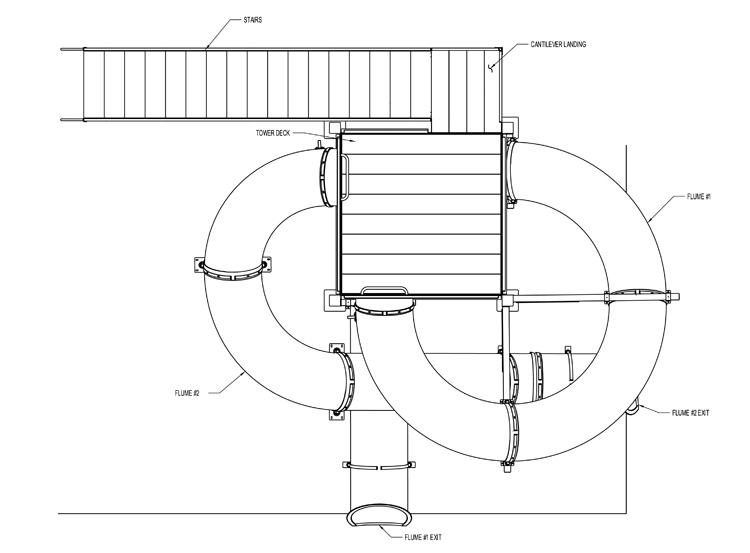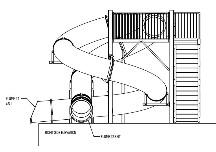 Description : Double fiberglass flume water slide featuring: 36” I.D. open fiberglass flume (Flume 1) and 32” I.D. closed fiberglass flume (Flume 2).